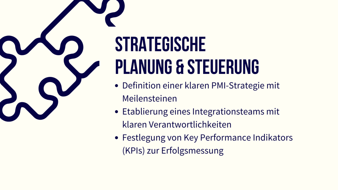 Post-Merger Integration (PMI) steht als Begriff für den Prozess, in dem zwei Unternehmen fusionieren oder das übernommene Unternehmen in die zukünftig gemeinsame Organisation überführt wird.